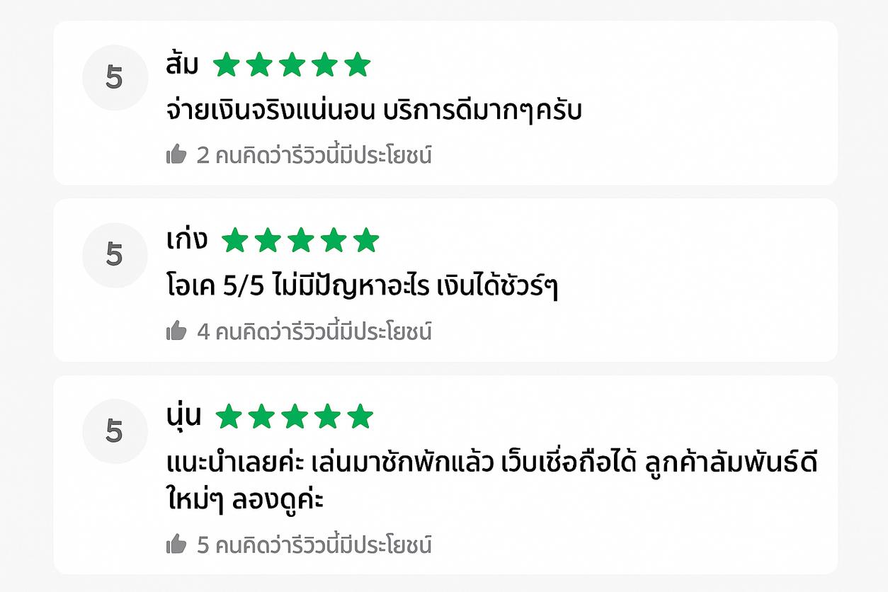 รีวิวของผู้ใช้งานจริงสามารถช่วยให้ผู้เล่นใหม่ทราบถึงประสบการณ์ของผู้เล่นท่านอื่น ๆ ได้ รีวิวที่ดีและหลากหลายสามารถเพิ่มความมั่นใจในการตัดสินใจเลือกเว็บไซต์ บ่อยครั้งเว็บที่มีความมั่นคงและจ่ายเงินจริง จะได้รับรีวิวเชิงบวกจากผู้เล่นมากมาย
